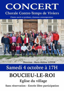 La ville de Boucieu-Le-roi accueillera dans l’église du village le samedi 4 octobre à 17h la chorale « Contre-Temps ». Une trentaine de Choristes de Viviers seront réunis…